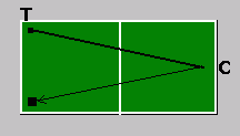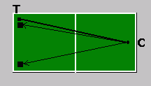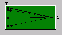 Необходимо, однако, заметить, что, наряду с отмеченными достоинствами, метод "MB" не лишен и определенных рамок применения. Это связано с тем, что сохраняемая в нем стандартность выполнения ударов, хотя и приближает условия к соревновательным, не может соответствовать им полностью. Величина параметров полета мяча (скорость, вращение, сила) отстает от соревновательных, особенно,если тренер не достаточно владеет техникой подачи мяча. В этом случае возможны даже нарушения техники игрока, выполняющего задание. Метод "MB" предполагает фиксированное место подачи мяча, что ведет к сужению объема внимания спортсмена. Теннисист теряет связь между предыдущим и последующим ударами, а тем самым снижается эффективность метода в плане развития тактического мышления игрока .Перечисленные ограничения показывают, что метод "MB" не заменяет, а дополняет тренировки с использованием одного мяча. Опыт китайских специалистов свидетельствует о том, что распределение времени на задания с большим количеством мячей и с одним мячом в пропорциональном отношении должно составлять 1:2, максимум 1:1 на начальном этапе обучения. Метод "MB" реализуется посредством следующих методик: 1) с участием тренера Обозначения:т - тренер с - спортсмен п - партнер